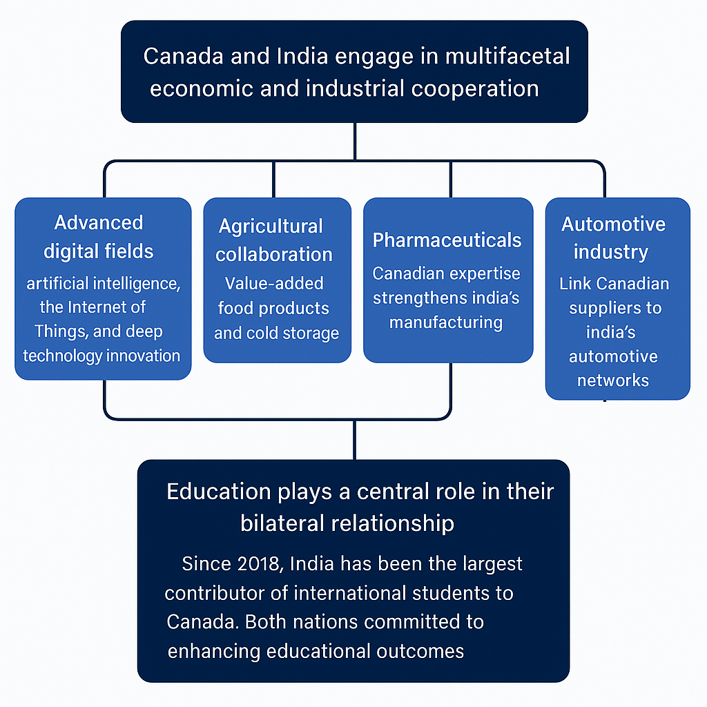 Canada and India engage in multifaceted economic and industrial cooperation across both cutting-edge and established sectors. Key areas of partnership include:Advanced digital fields such as artificial intelligence, the Internet of Things, and deep technology innovation.Agricultural collaboration, focusing on value-added food products and enhancing supply chain systems like cold storage.Pharmaceuticals, where Canadian expertise contributes to the strength of India’s pharmaceutical manufacturing.Automotive industry, with efforts to link Canadian suppliers into India’s automotive production networks.Education plays a central role in their bilateral relationship. Since 2018, India has been the largest contributor of international students to Canada. Both nations are committed to enhancing educational outcomes through institutional cooperation and skills development initiatives.